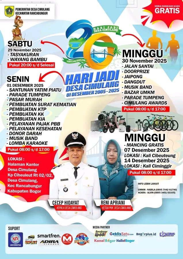 Rangkaian perayaan tidak berhenti di situ. Pada tanggal 7 dan 14 Desember, akan diadakan acara mancing gratis untuk seluruh masyarakat Desa Cimulang. Kegiatan ini akan digelar di Kali Cibeteng dan Kali Ciminggir yang masih berada di wilayah Desa Cimulang.